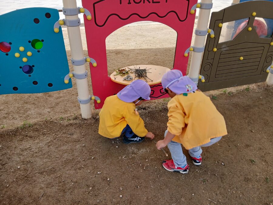 今日は外で遊んでいると、汗ばんできて園服を脱ぐ子がたくさん。