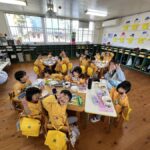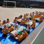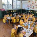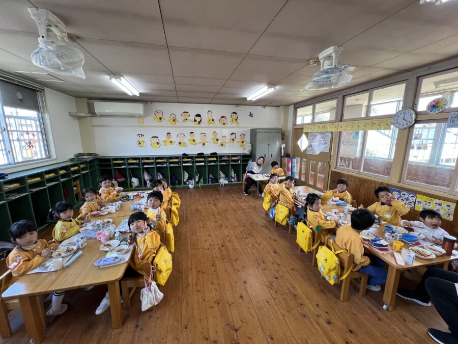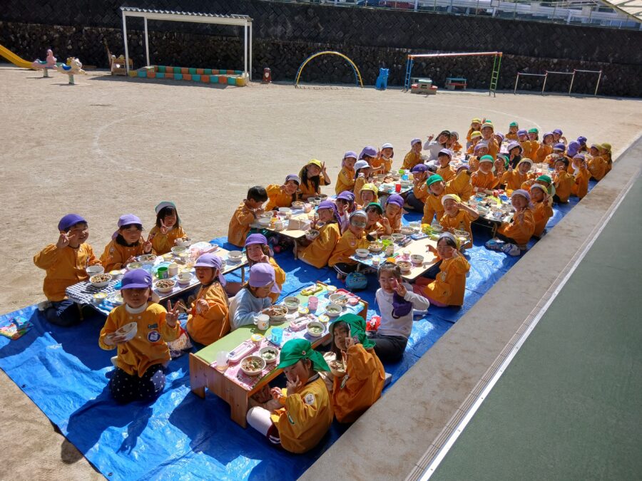 給食も園庭で一緒に食べて、すみれ組さんとの楽しい思い出ができました♪