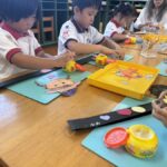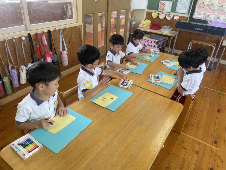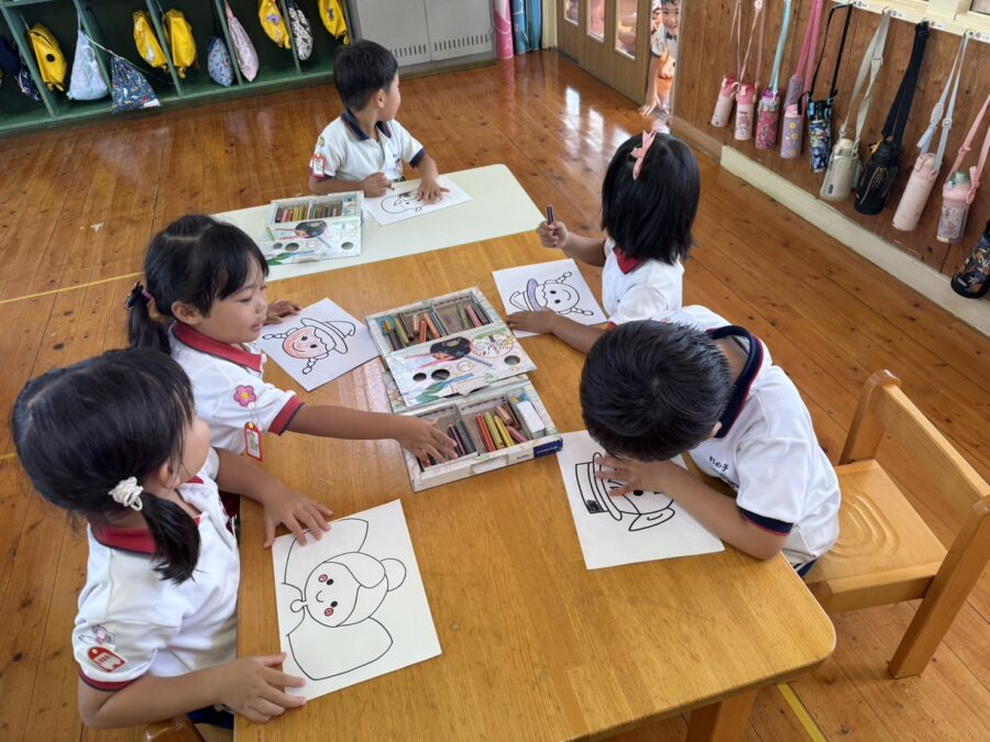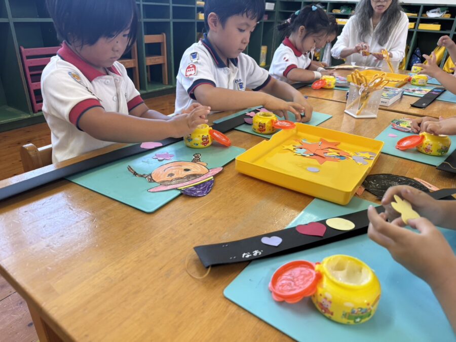 みんなが楽しみにしているハロウィンパーティーに向けて、お面とお菓子入れ作りをしました。