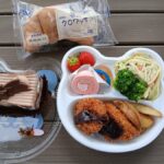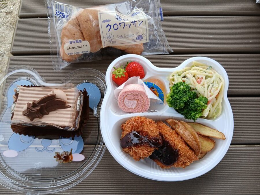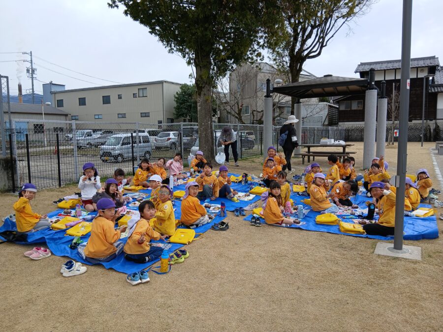 特別に給食をお弁当に詰めてもらい、公園で食べてきましたよ。