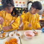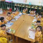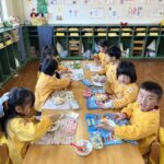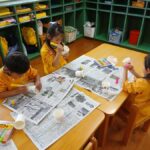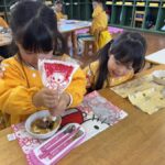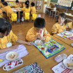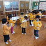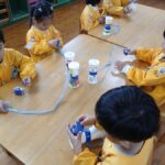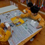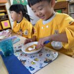 今日の年中組さんは、お正月遊びの「けん玉」を自分たちで作って遊びました。