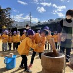 年長組さんがお餅をつく姿を小さい子たちが「よいしょ!よいしょ!」と掛け声をかけ応援しました。