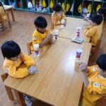 紙コップに好きな絵を描いたり、シールを貼ったり、それぞれ素敵なけん玉ができました♪