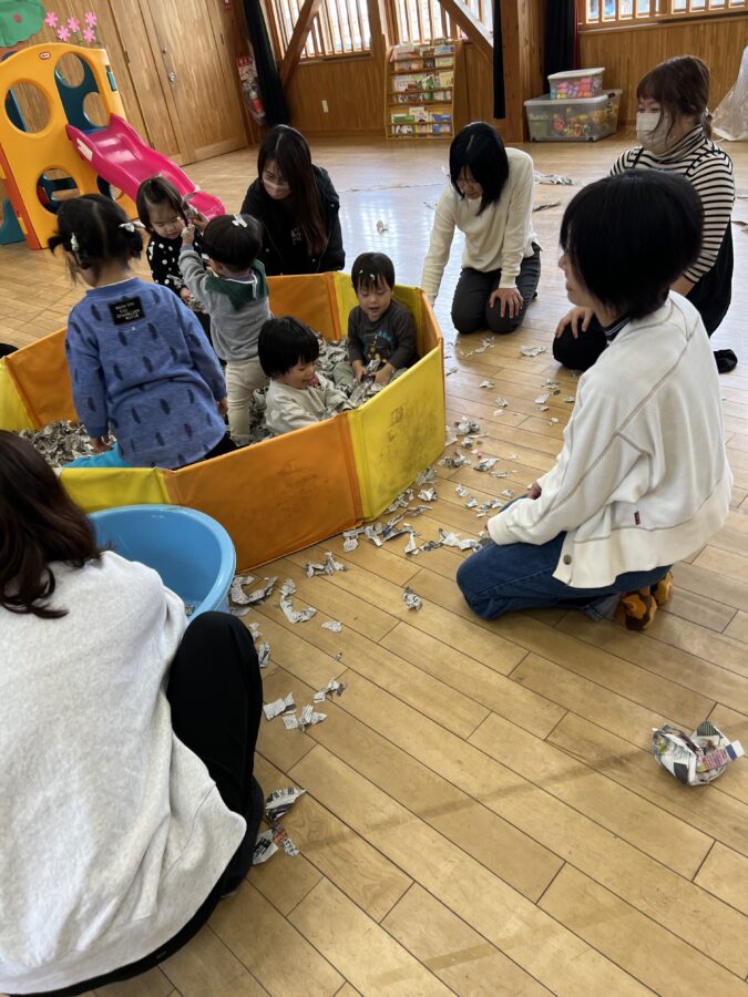 本日のコアラクラブの活動は、新聞遊びとふれあい遊びでした。