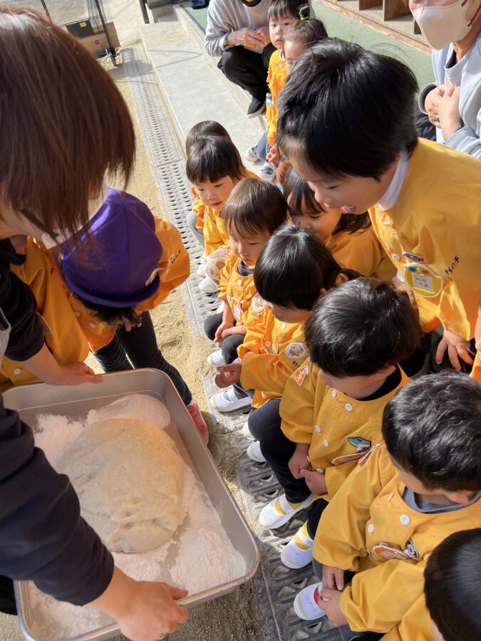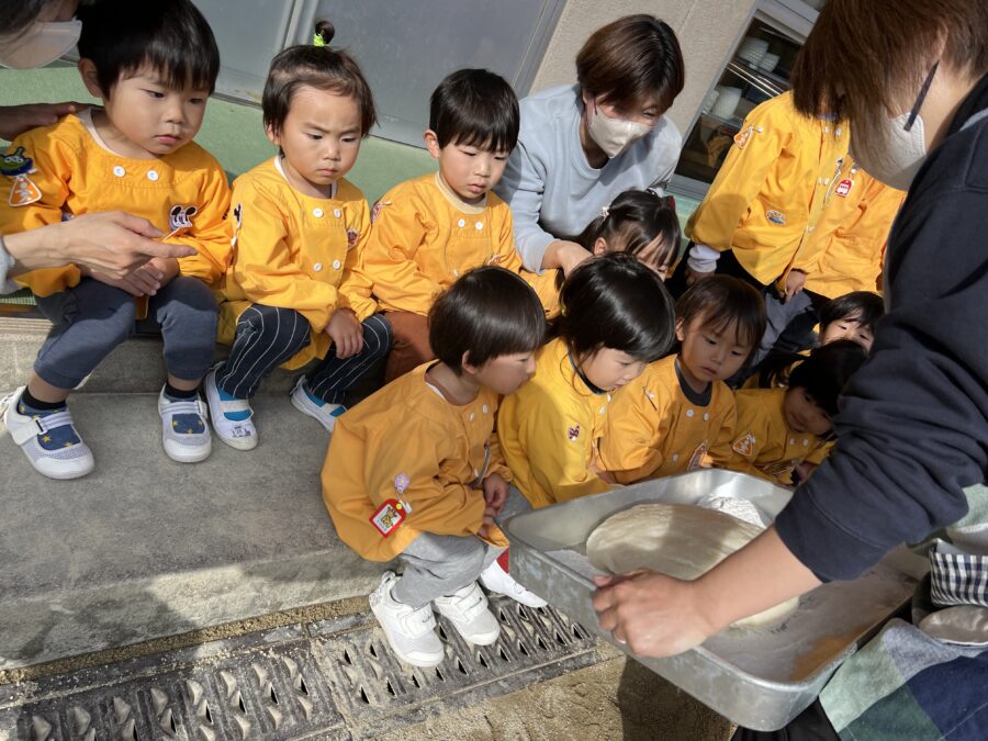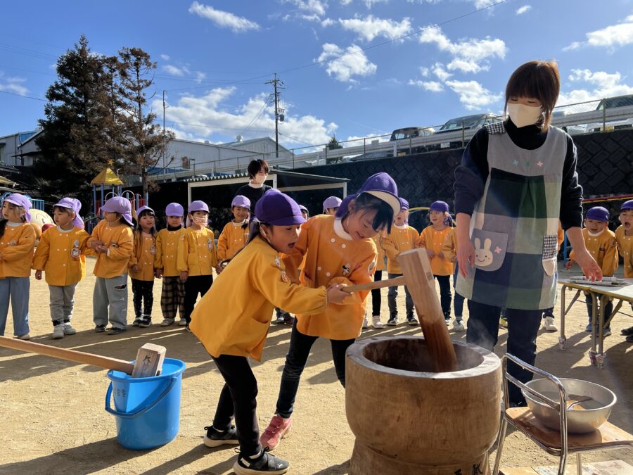 年長組さんがお餅をつく姿を小さい子たちが「よいしょ!よいしょ!」と掛け声をかけ応援しました。
