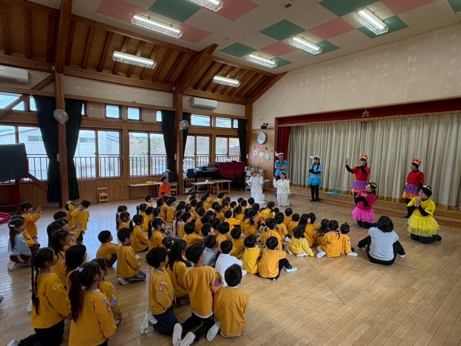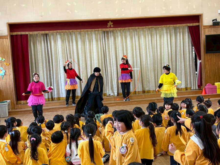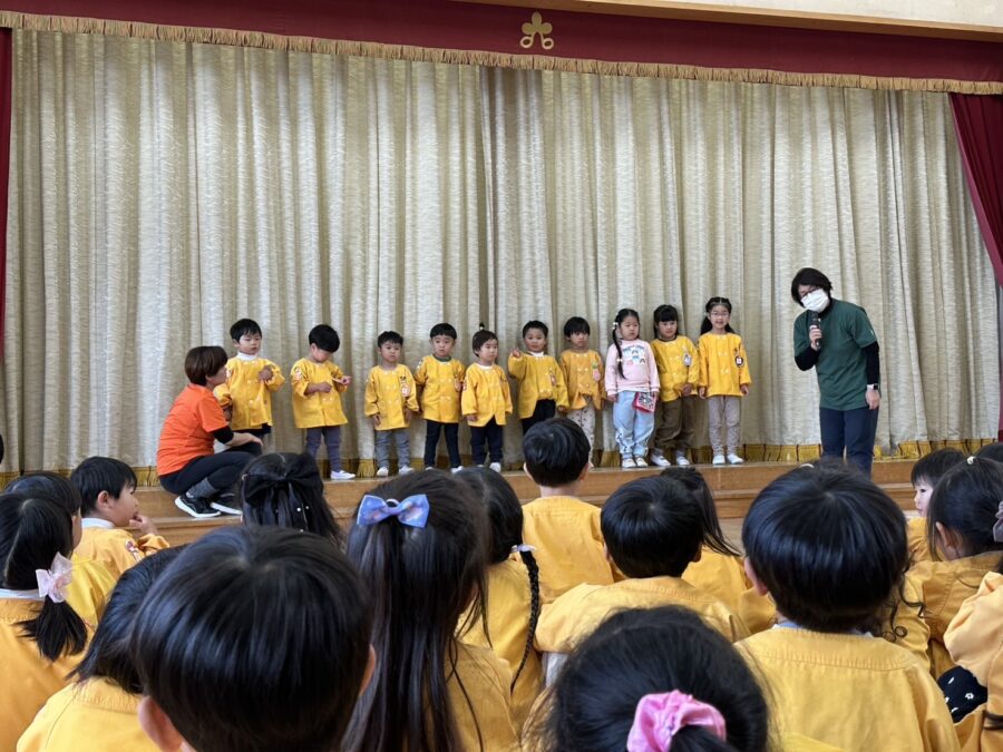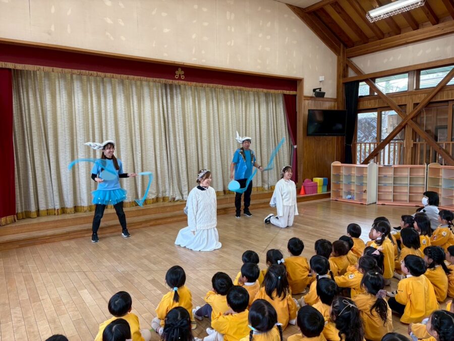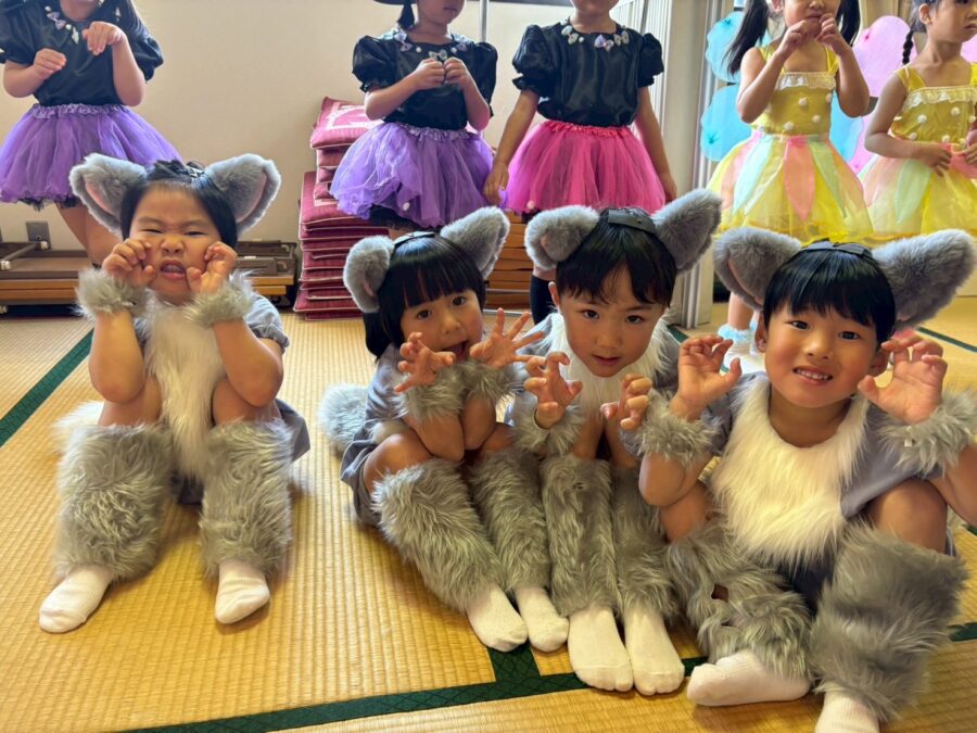 今月のお楽しみは、すみれさんが発表会で演じた「北風と太陽」を先生達で披露しました。