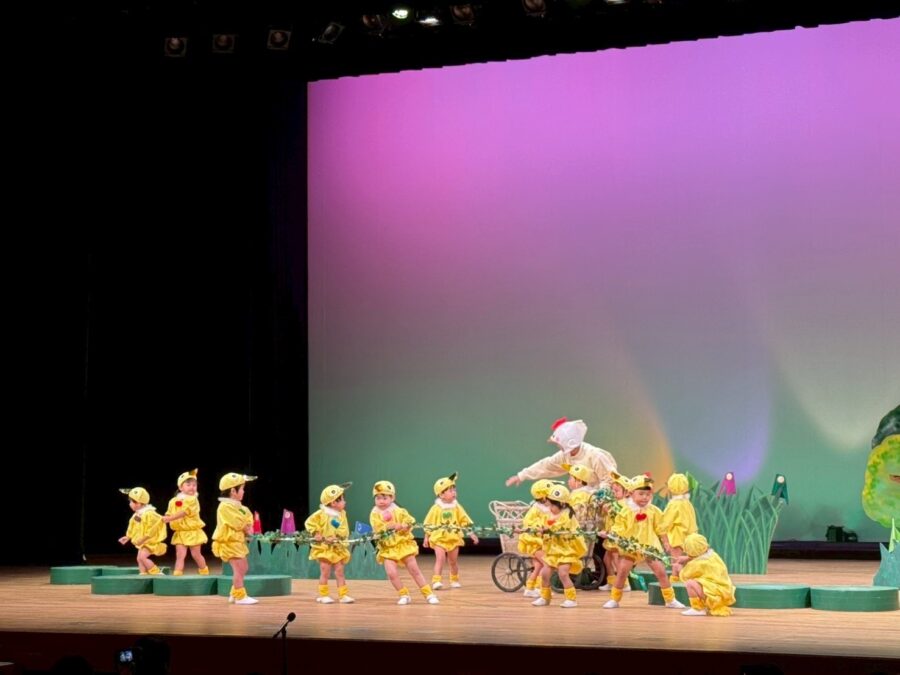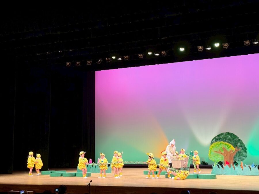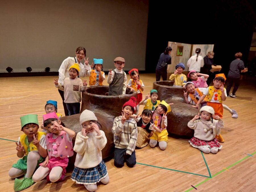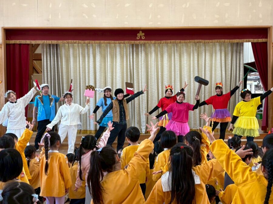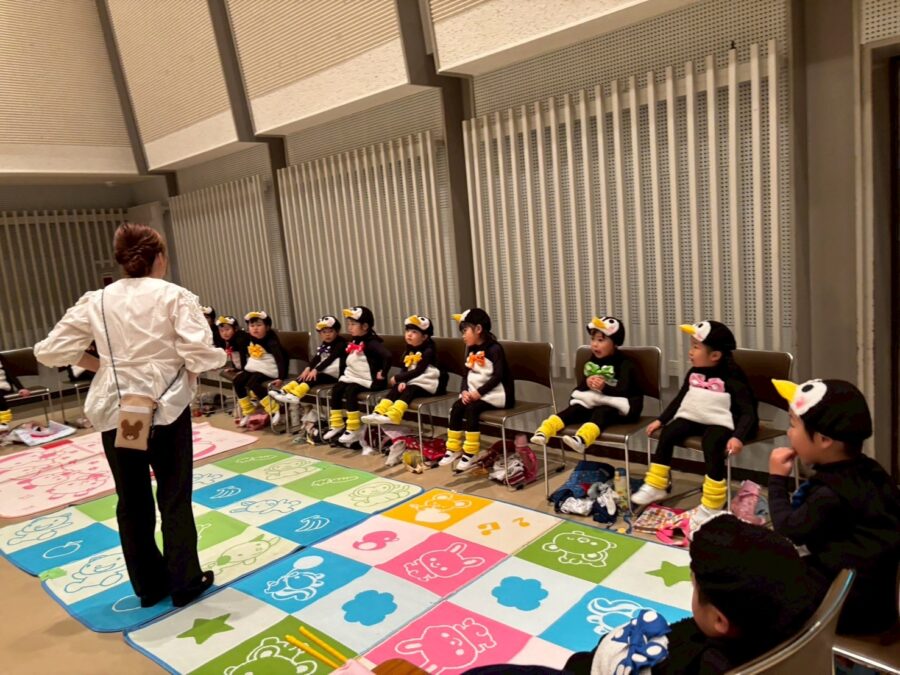 今月のお楽しみは、すみれさんが発表会で演じた「北風と太陽」を先生達で披露しました。