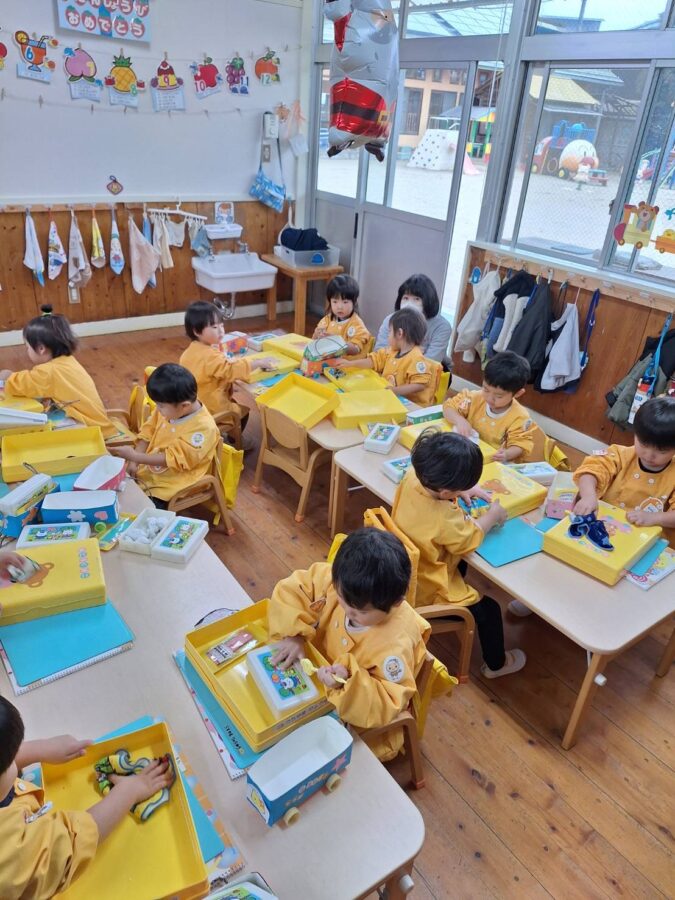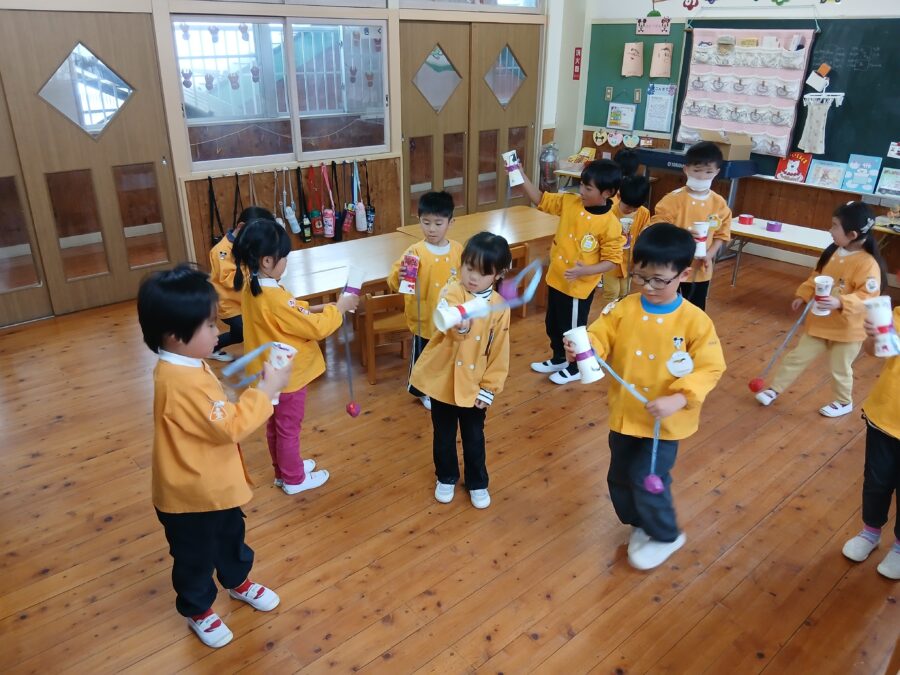 今日の年中組さんは、お正月遊びの「けん玉」を自分たちで作って遊びました。