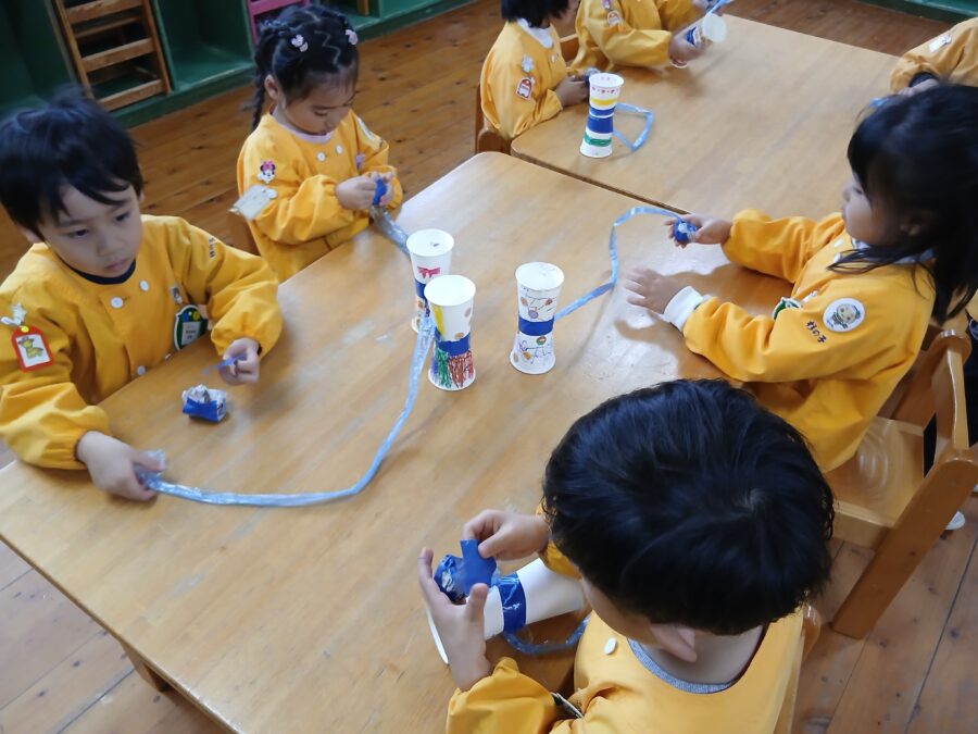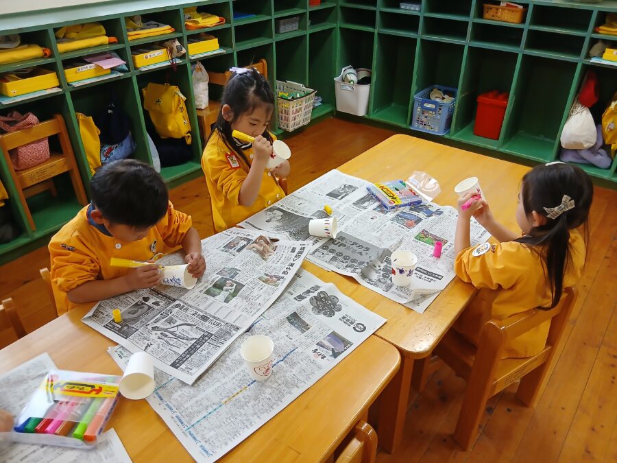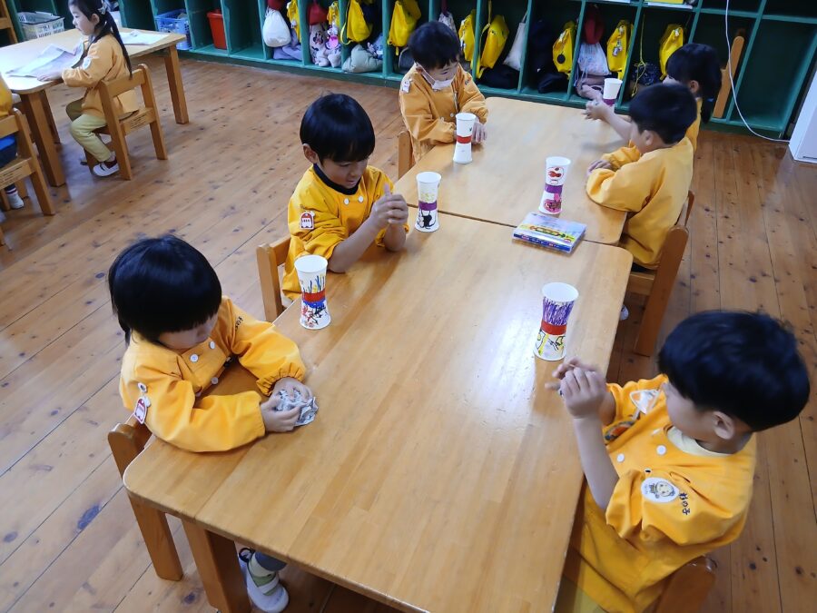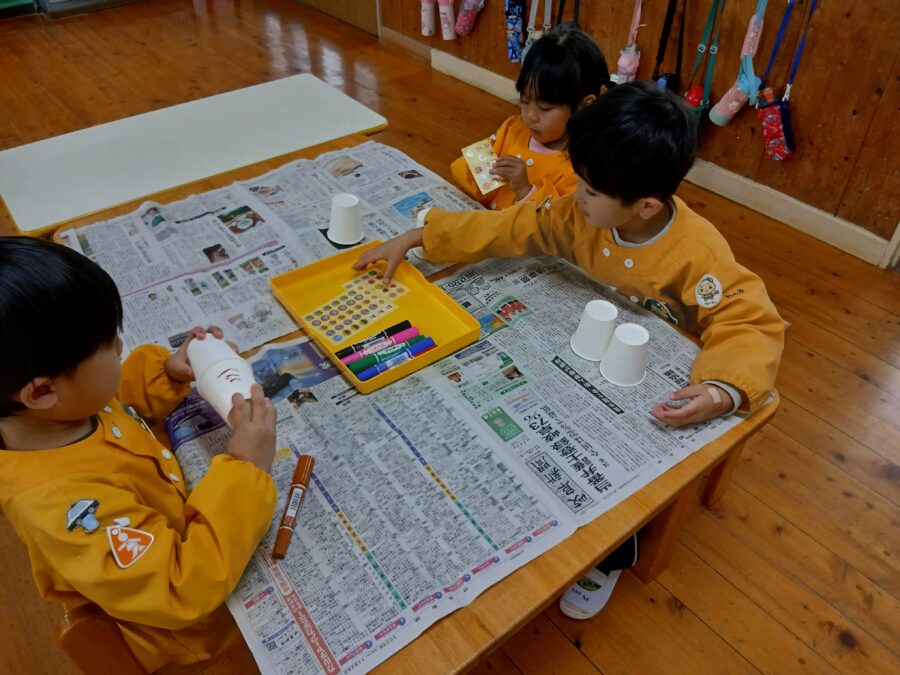 紙コップに好きな絵を描いたり、シールを貼ったり、それぞれ素敵なけん玉ができました♪