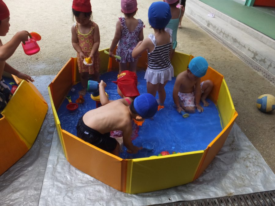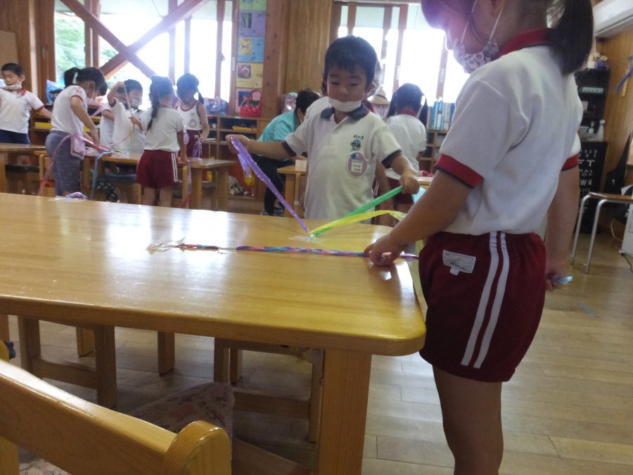 最後の写真は、手作りのうちわで北風さんの真似をする、りす組さん。憧れのお兄さんお姉さんですね。